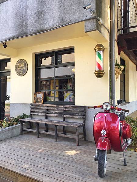 這是一家髮廊,外面停放一台偉士牌相當有復古味