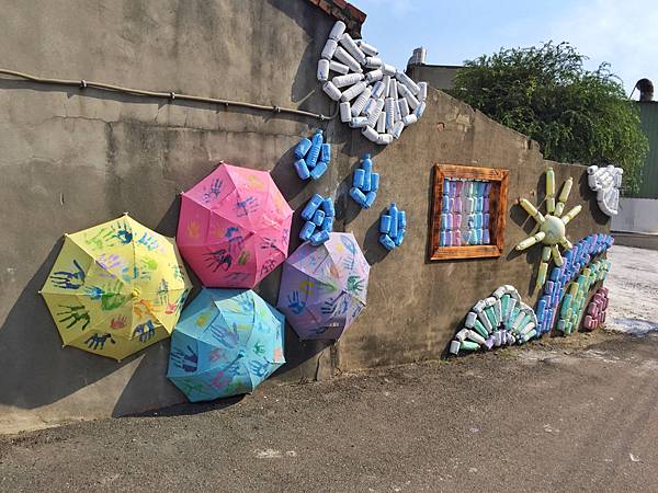 入口處有用回收瓶瓶罐罐和DIY的雨傘做出的入口意象