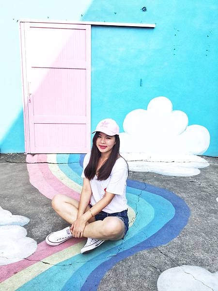 旁邊有個小屋門口畫上彩虹步道真的可愛
