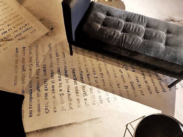 連地板的裝飾都用外文的書內文營造出文藝氛圍