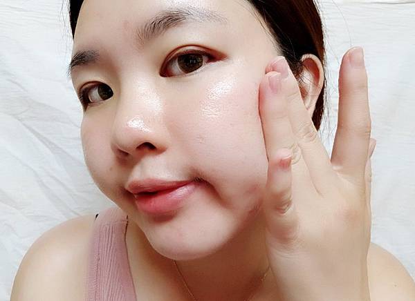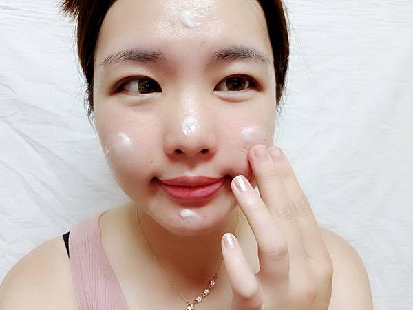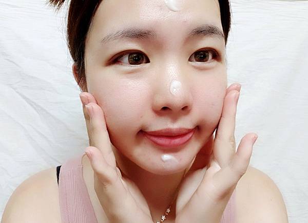 用手將水凝霜輕抹在兩頰、額頭、下巴、鼻尖